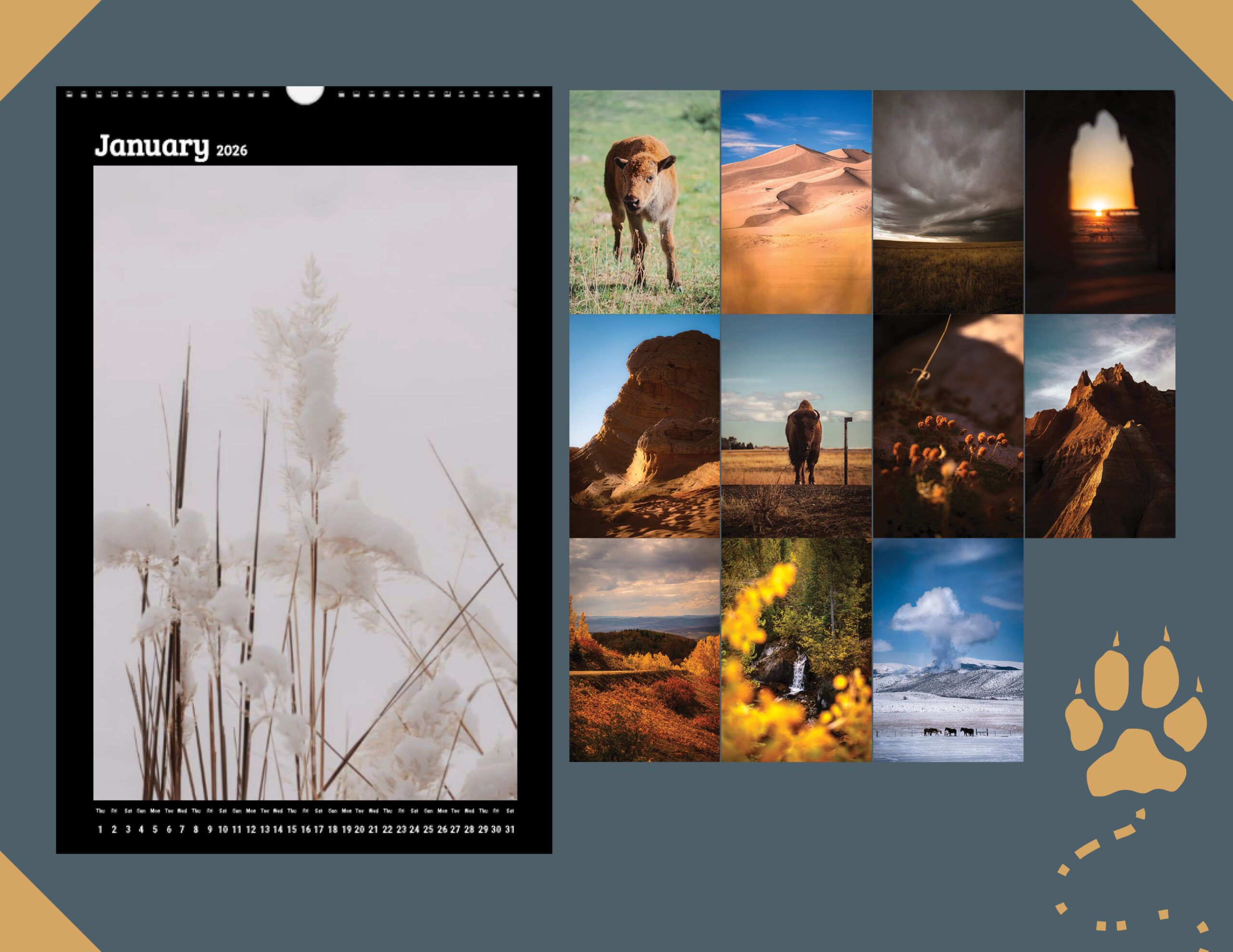 This 11×17 wall calendar showcases expansive landscape photography at a larger scale, allowing the details of light, texture, and place to fully unfold. Each month highlights a moment shaped by movement through wild places — designed to feel immersive without overwhelming the room.