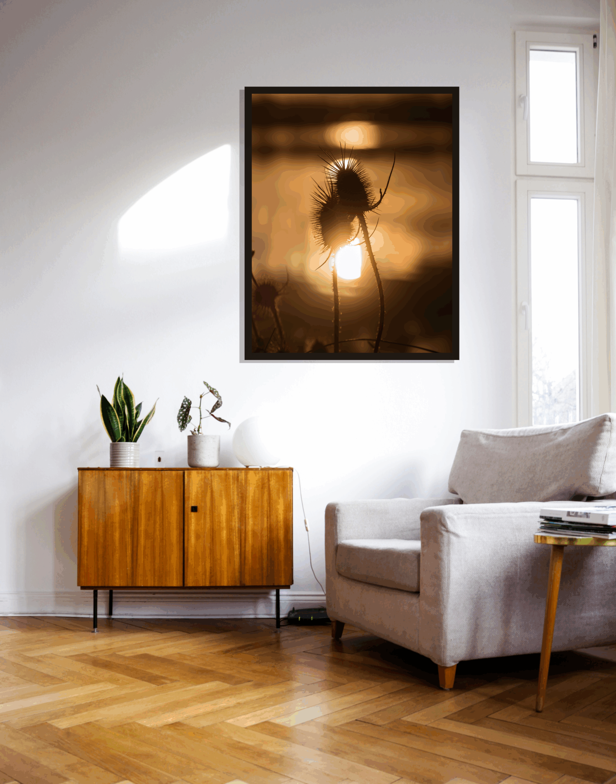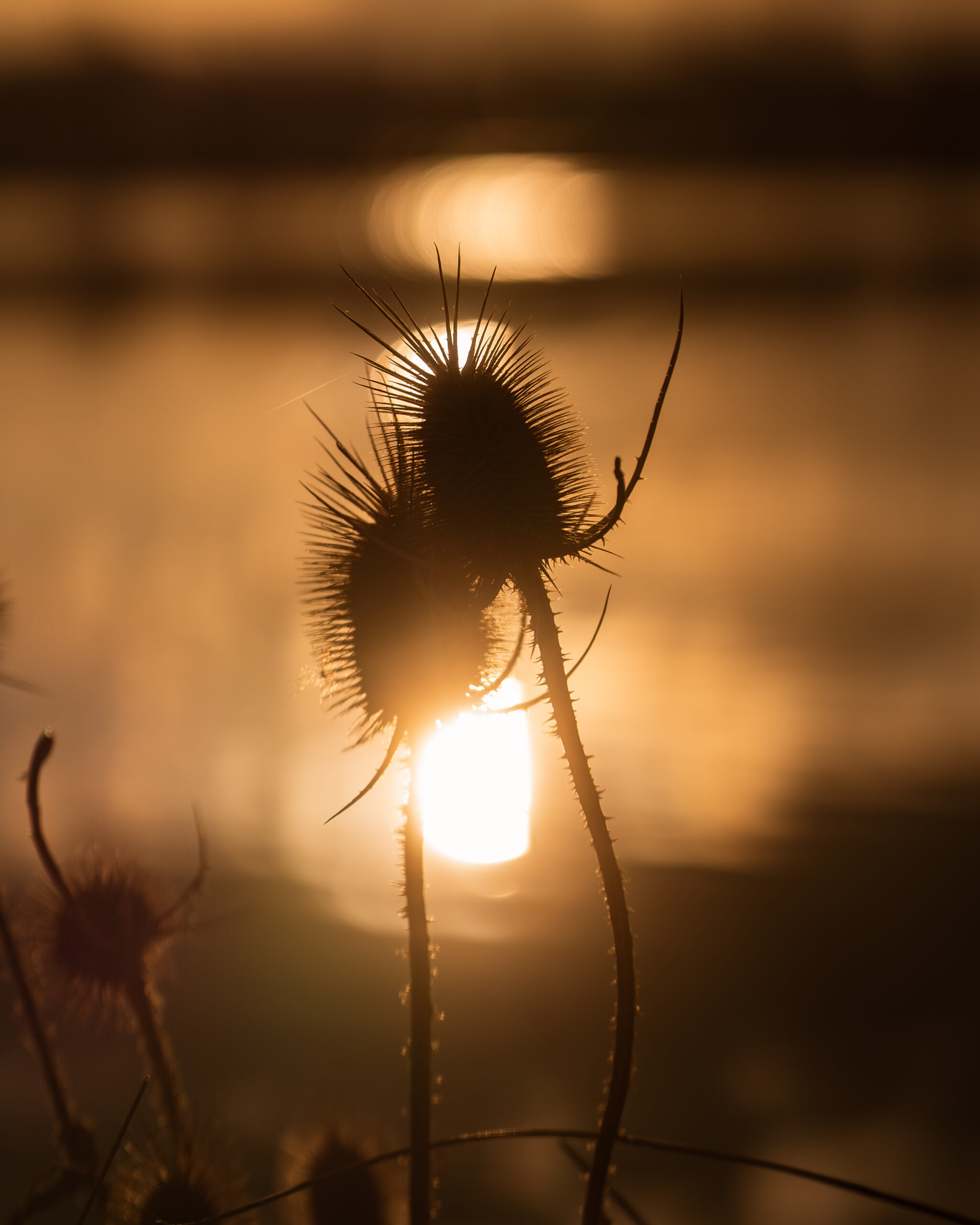 A backlit thistle stands along a trail in Fort Collins, Colorado, against the glow of sunset. This photograph captures the sharp outline of the plant in warm evening light. Available as a Fine Art, metal, acrylic and poster print.