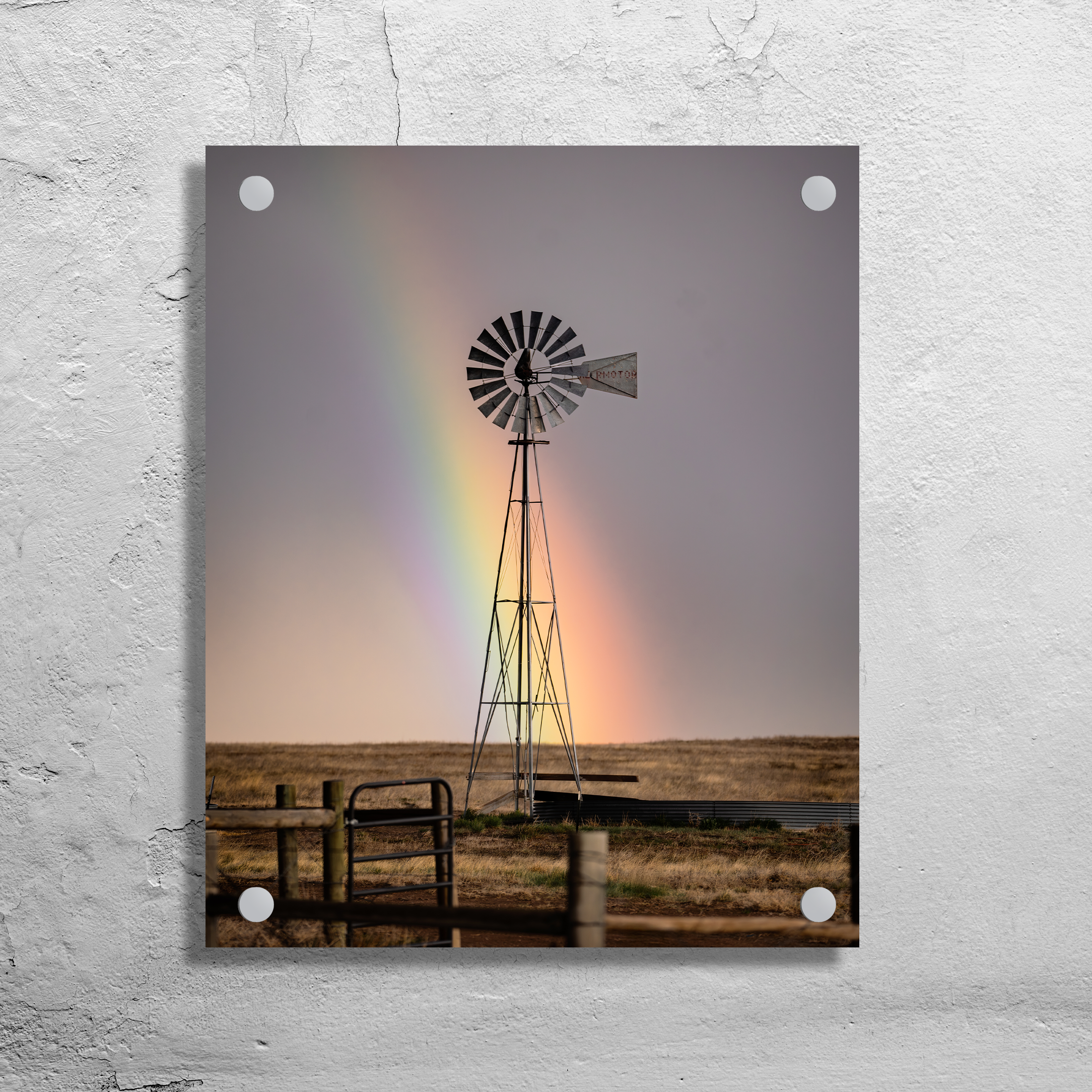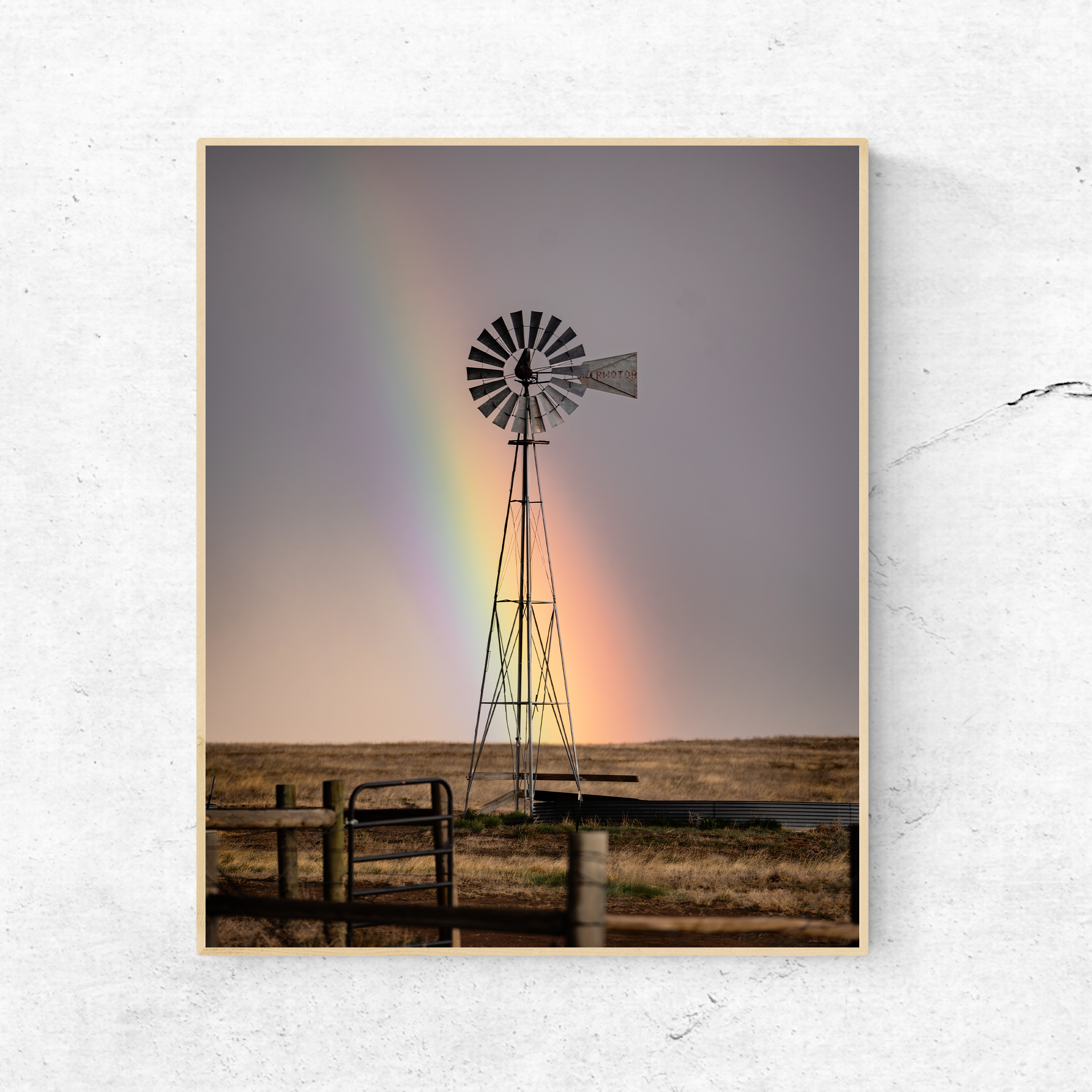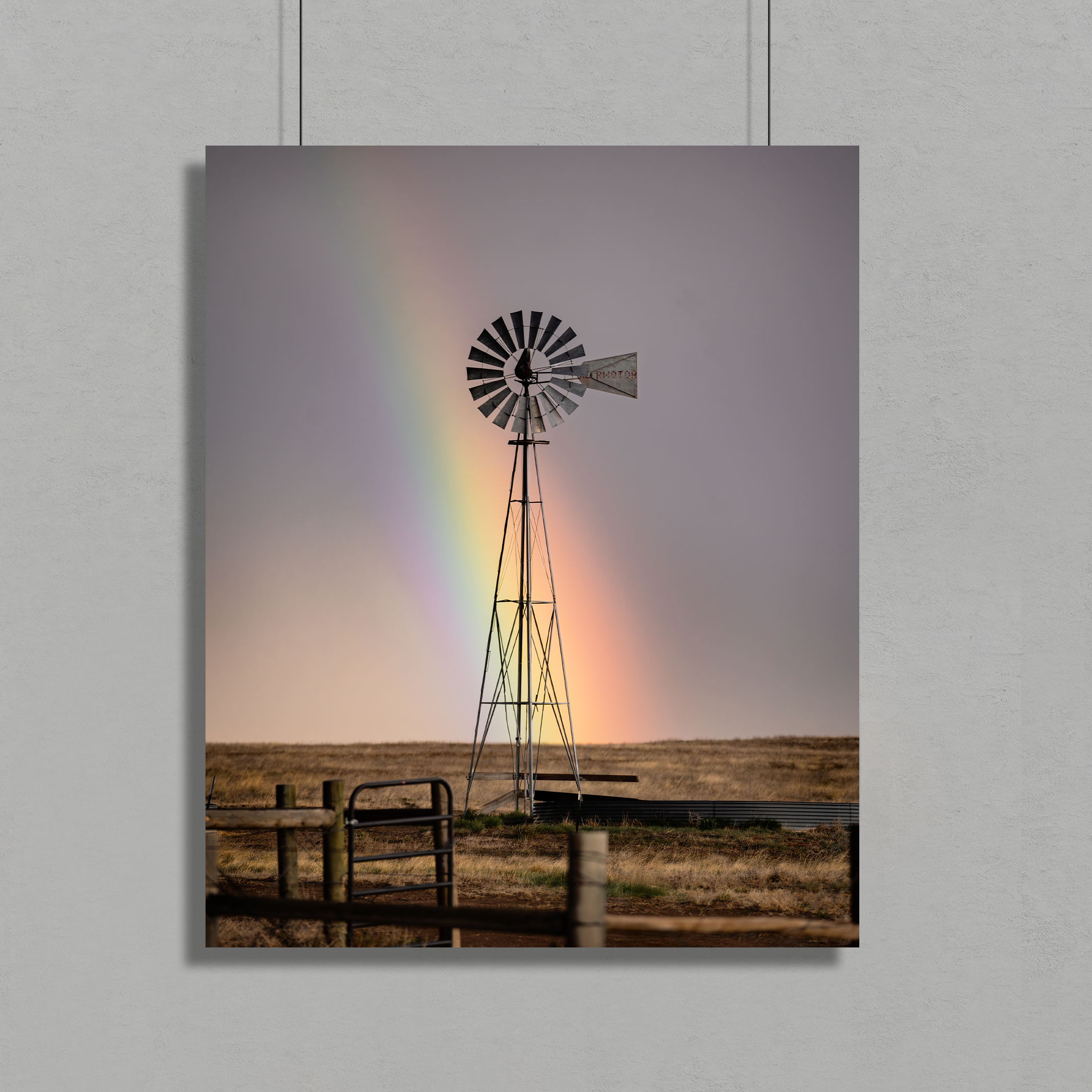 A rainbow arcs behind a windmill after a storm near Pawnee Grasslands, Colorado. This limited edition photograph joins weather, land, and memory in a fleeting scene across the open plains.