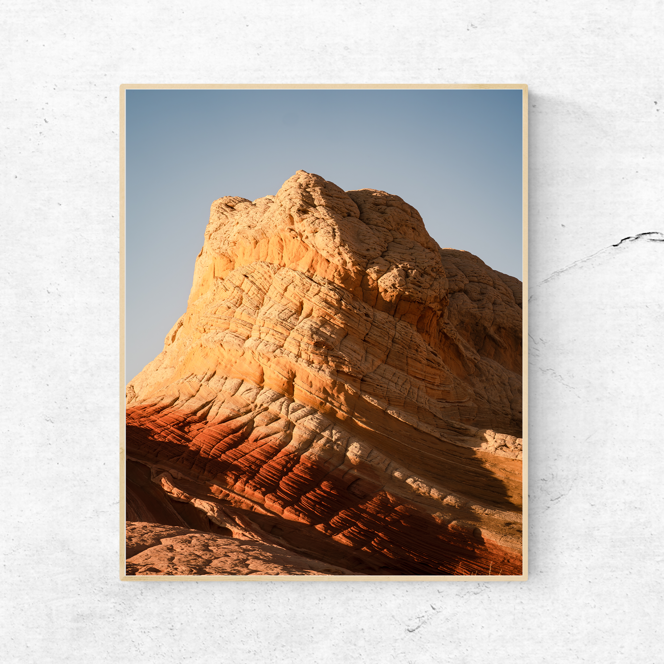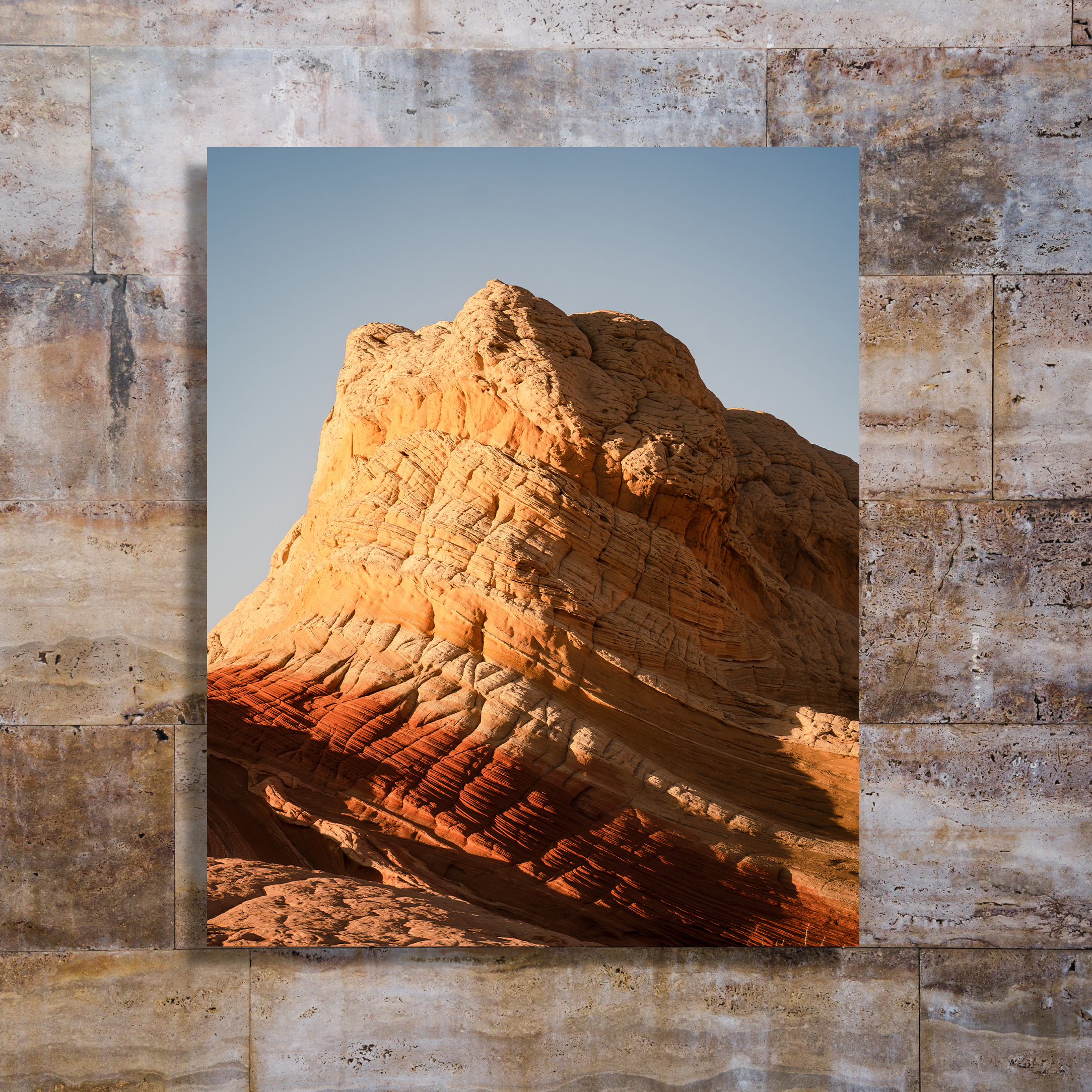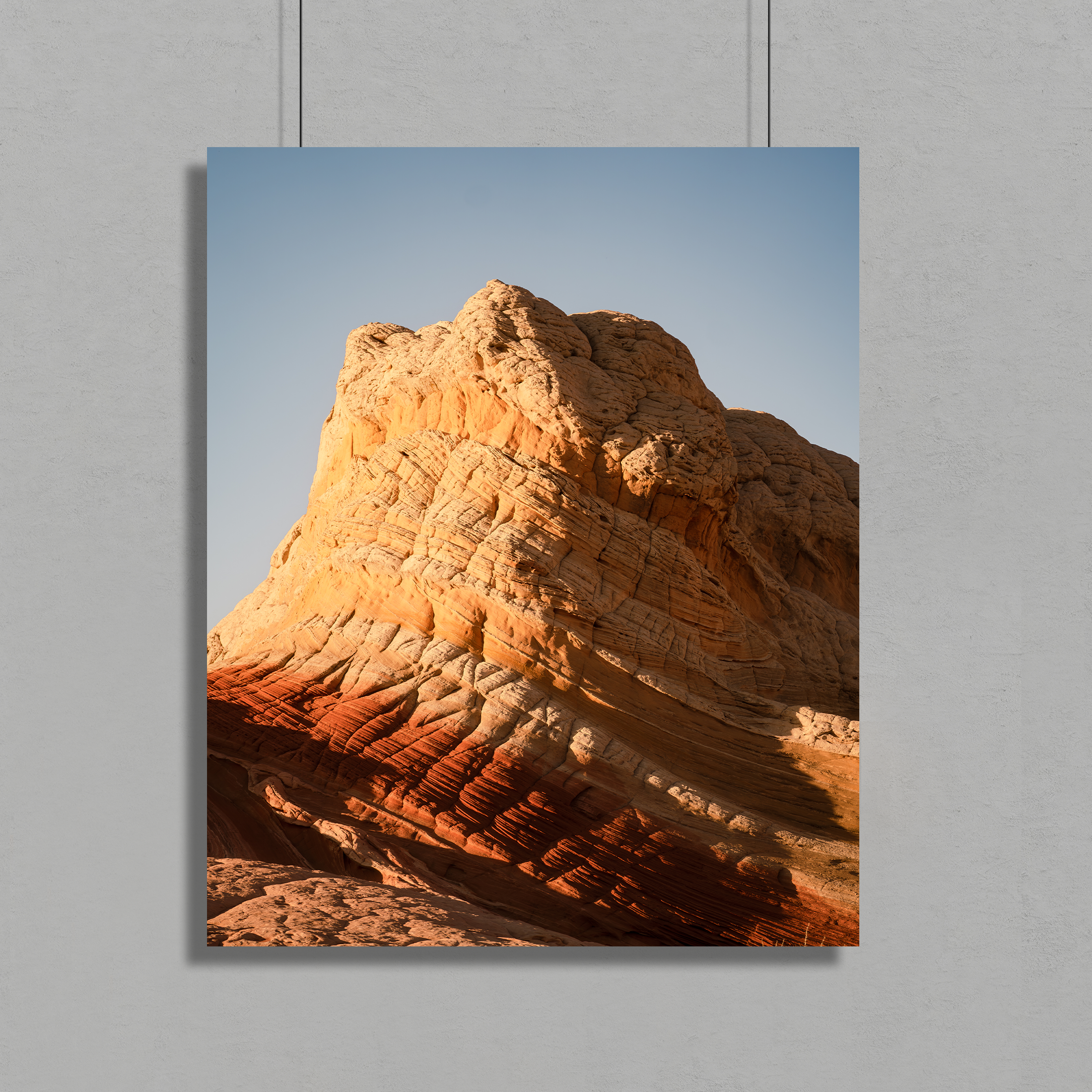 Sandstone layers show red and gold tones at White Pocket in Arizona. This photograph captures the form and texture of the desert shaped by time.